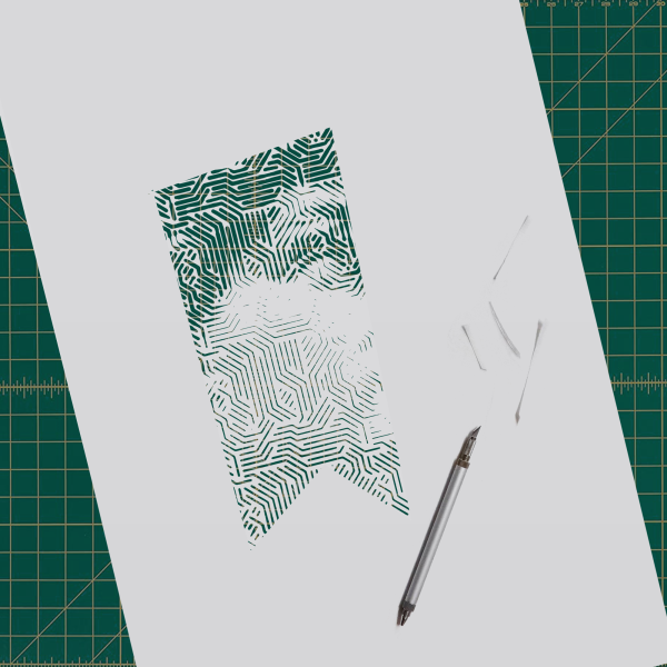 A papercut portrait formed through precise diagonal cuts that reveal a dark underlying layer, using negative space and subtle visual vibration to present identity as layered and revealed through removal rather than addition.