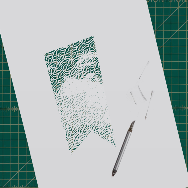 A papercut portrait formed through precise diagonal cuts that reveal a dark underlying layer, using negative space and subtle visual vibration to present identity as layered and revealed through removal rather than addition.