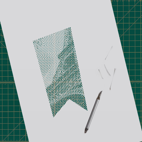 A papercut portrait formed through precise diagonal cuts that reveal a dark underlying layer, using negative space and subtle visual vibration to present identity as layered and revealed through removal rather than addition.