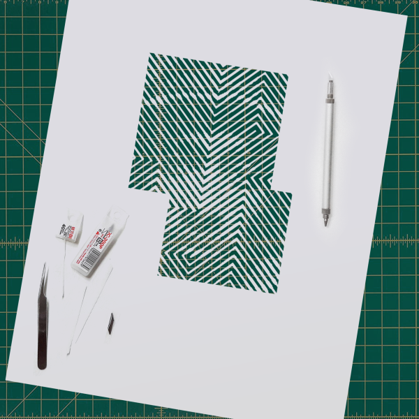 A papercut portrait formed through precise diagonal cuts that reveal a dark underlying layer, using negative space and subtle visual vibration to present identity as layered and revealed through removal rather than addition.