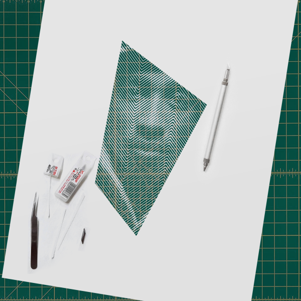 A papercut portrait formed through precise diagonal cuts that reveal a dark underlying layer, using negative space and subtle visual vibration to present identity as layered and revealed through removal rather than addition.